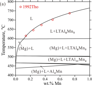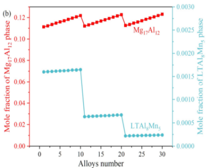 图13.Mg-Al-Zn-Mn合金热力学及腐蚀行为研究:(a)基于数据库计算的Mg-0.095Al-0.0084Zn-Mn垂直截面与实验数据的比较;(b)计算的Mg-Al-Zn-Mn合金中Mg17Al12相和LTAl8Mn5 相的摩尔分数;(c)基于数据库设计的Mg-Al-Zn-Mn合金在3.5 wt.% NaCl 溶液中的动电位极化曲线.