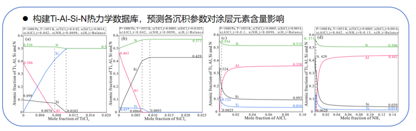 图3.热力学计算所得各沉积参数对CVD TiAlSiN涂层元素含量影响