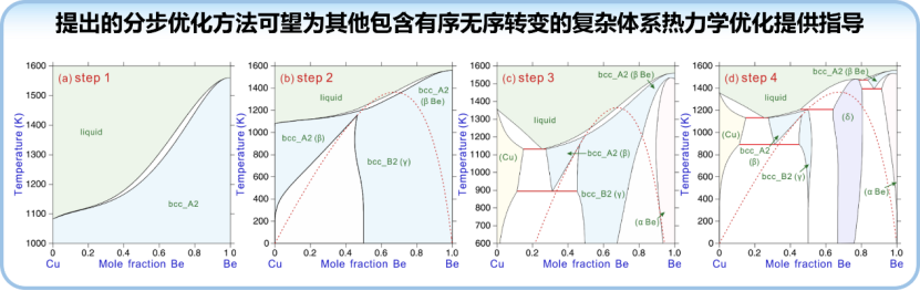 (1)在优化包含有序无序转变的Cu-Be体系时,基于密度泛函理论计算了有序相bcc_B2的形成焓,并提出了分步的热力学优化步骤。提出的分步优化方法可望为其他包含有序无序转变的复杂体系热力学优化提供指导。此外,基于CALPHAD方法,构建了包含26个元素的铜合金体系fcc相和液相的扩散动力学数据库。结合计算模拟和实验研究开展了Cu-Cr系合金的微结构和性能研究。