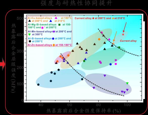 图12.研究组进行耐热高强铝合金设计的案例示意图。基于相图计算来分步调控成分,在避免高温易粗化S相以及硬脆Si相的生成的同时优化Mg/Si元素含量比,再根据已选定的Ag和Mg/Si比例,确定Mg和Si的具体添加量,促进含有C/L相以及AgMg偏聚结构的多重界面结构生成,实现对主强化相θ′的有效包覆,极大地抑制了析出相的粗化,而在时效热处理过程早期形核的C/L相可以作为中期形核的θ′相的异质形核点,提高了θ′的数密度,因而合金实现了强度与耐热性的协同提升[Nat. Commun. 14 (2023) 2959]