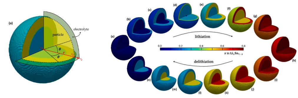 图17.LixSn理想球型负极颗粒的充放电循环过程的建模(左图)及模拟研究(右图)