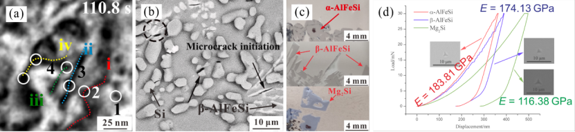图10.对铝合金纳米至微米尺度物相的力学行为/性质的研究成果举例。(a)Al-Mg-Si合金变形过程中β″被位错切过的TEM原位拉伸试验,(b)Al-Si-Mg合金变形过程中的SEM原位拉伸试验,(c)制备的毫米级超大第二相单晶颗粒及其(d)纳米压痕曲线和弹性模量测量值