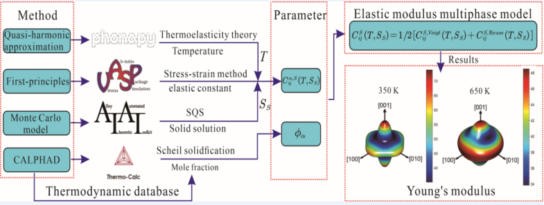 (4)弹性模量通常用来评价材料的力学性能,如塑性、脆性、强度、硬度等。如何有效并可靠的计算两相及三相以上合金的弹性模量,对于合金材料的设计研发具有重要意义。本工作基于第一性原理计算和CALPHAD方法提出了一种计算有限温度下多相合金弹性模量的方法。首先,基于两种极限提出了多相合金弹性模量的计算模型;其次,考虑温度和固溶度通过第一性原理计算单相的刚度矩阵;然后,通过CALPHAD方法计算合金的相分数和温度,获得多相合金在有限温度的刚度矩阵,从而实现多相合金弹性模量的高效计算。计算方法的可靠性通过实验测得的两相和三相Mg-Al-Si合金的弹性模量得以验证。基于该计算方法,我们对Mg-Al-Si合金623K宽广成分的弹性模量进行了深入描述,并预测了高弹性模量的成分范围。