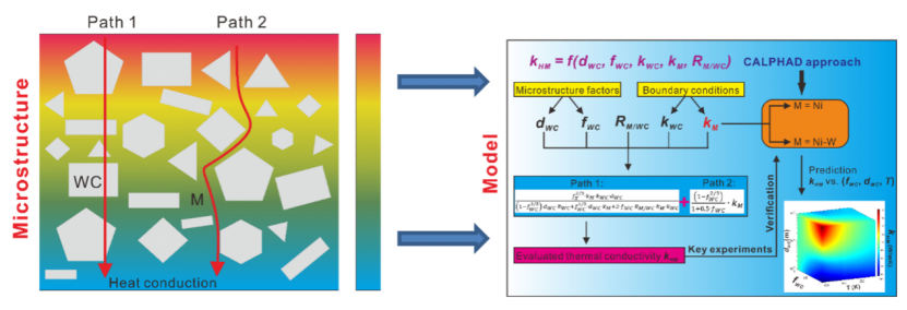 (2)围绕热导率预测模型的构建和计算软件的开发展开了一系列研究工作。基于微结构发展了描述两相复合材料热导率的模型,首次建立了WC的热导率随晶粒尺寸和温度变化的关系,并成功预测了WC/Co、WC/Ag和WC/WC界面的界面热阻,并成功应用于WC-Co-TiC三相硬质合金的热导率预测。该模型不仅考虑了温度、晶粒尺寸和相分数等因素,还首次引入了Co/(Ti,W)C界面热阻的概念,实现了对复杂多相系统热导率的精确预测。相关模型均已程序化并植入团队研发的CALTPP(CALculation of ThermoPhysical Properties)热物性计算软件中,相关研究人员可以利用该软件优化或获取目标材料体系的热导率数据。