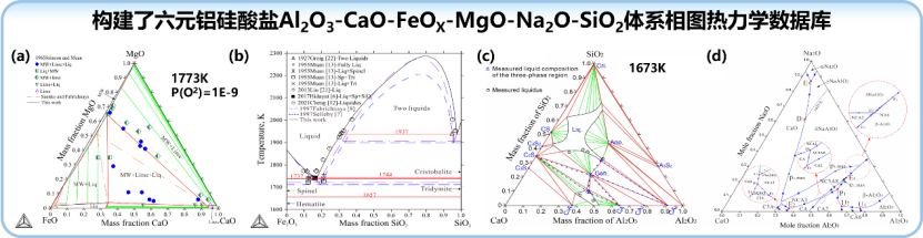 (2)以大宗铝硅酸盐固废中典型氧化物Al2O3、CaO、FeOX、MgO、Na2O和SiO2为研究对象,采用CALPHAD方法和关键相图实验研究,开展了Al2O3-CaO-FeOX-MgO-Na2O-SiO2体系相关二元系和三元系的相图热力学研究。在子体系的相图热力学基础上,构建了六元铝硅酸盐Al2O3-CaO-FeOX-MgO-Na2O-SiO2相图热力学数据库,实现相图、热力学性质、相变驱动力和凝固过程等的计算模拟,为固废材料化应用提供指导。