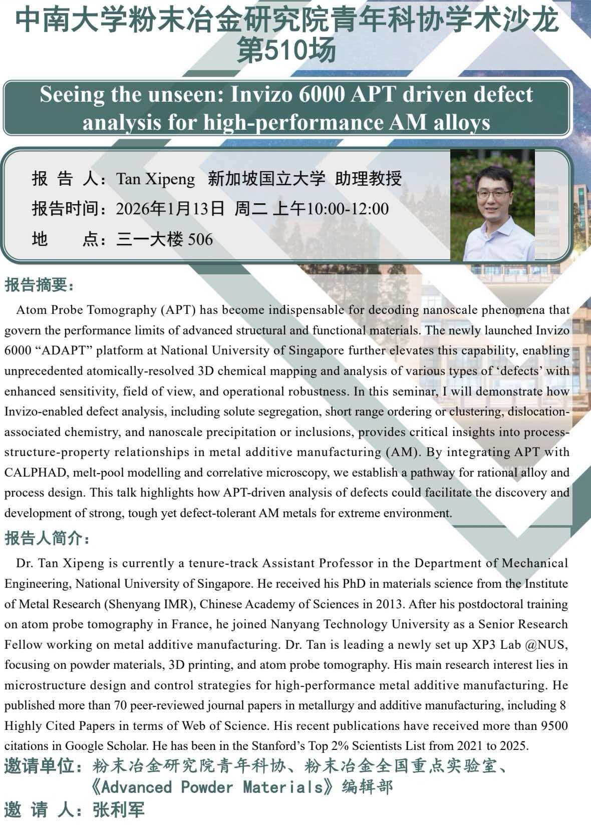 青年科协沙龙(第510场):Seeing the unseen: Invizo 6000 APT driven defectanalysis for high-performance AM alloys