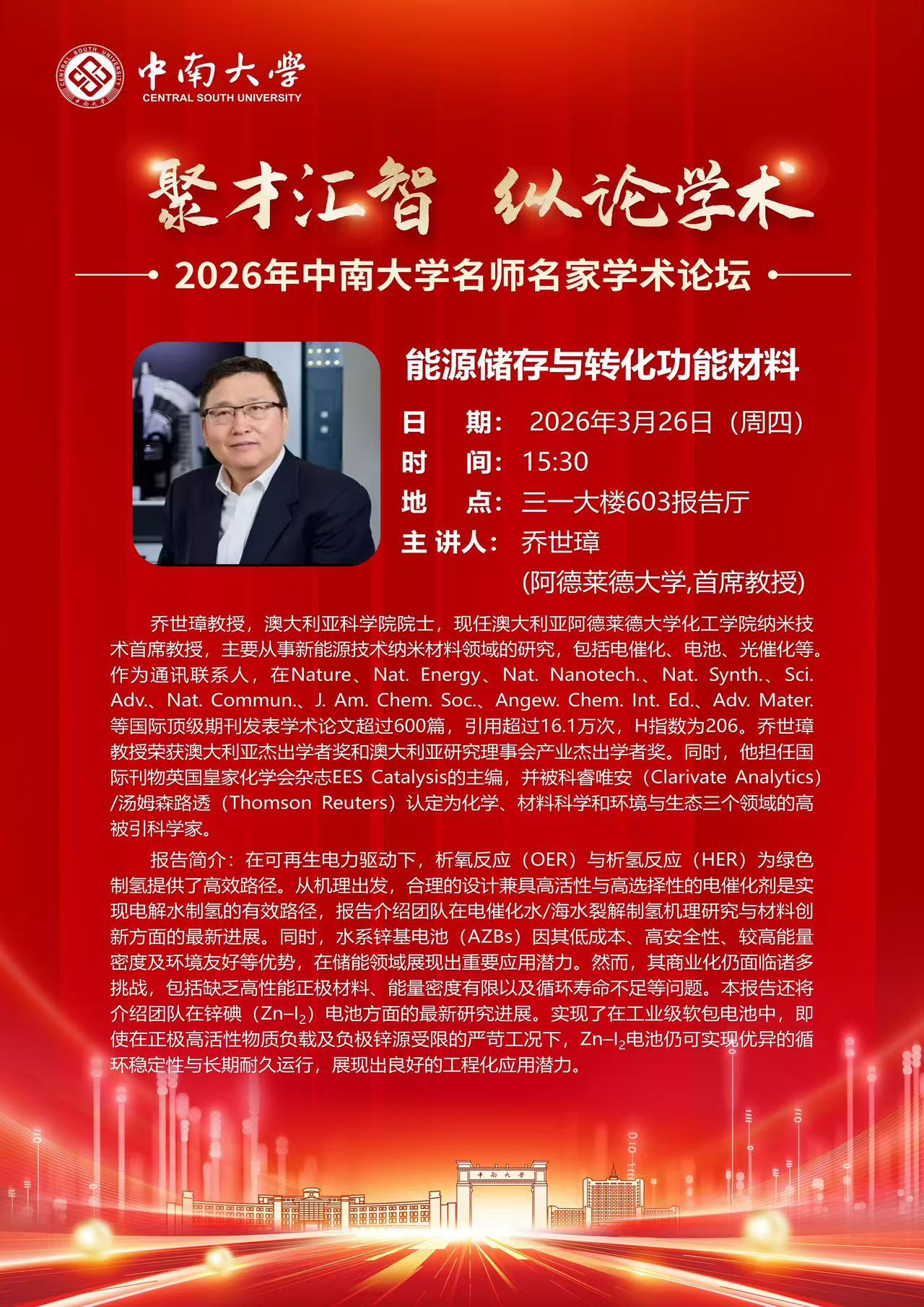 2026年中南大学名师名家学术论坛——乔世璋(能源储存与转化功能材料)