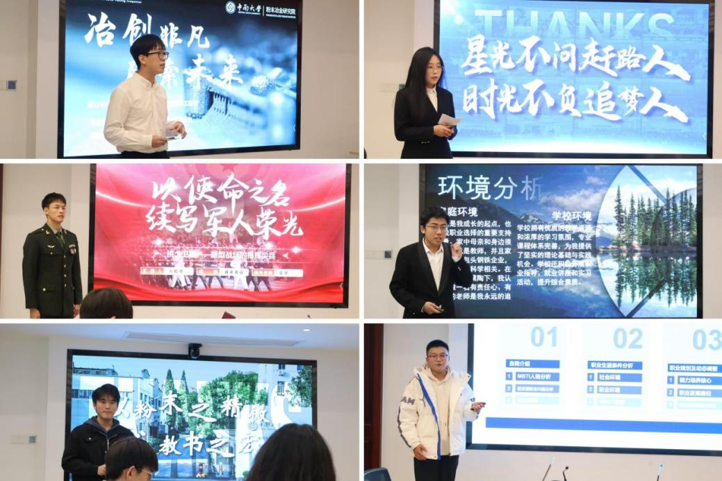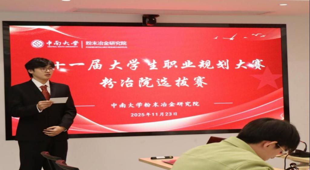 2025年11月23日,中南大学第十一届大学生职业规划大赛粉末冶金研究院选拔赛在三一大楼顺利举行。粉冶院辅导员张翠、李卉淼、刘滨睿、于旻澍,第二届国赛金奖获得者黄绍祯共同担任评委。活动由周翔宇同学主持。