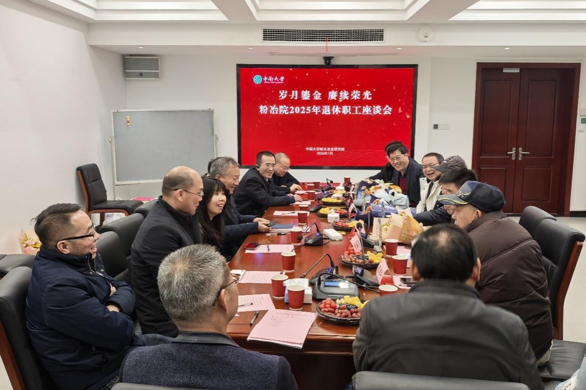 2026年1月8日下午,粉末冶金研究院“岁月鎏金,赓续荣光”2025年退休职工座谈会在三一大楼406-1顺利开展。易茂中、陈康华、王坪龙、李度成、胡春凯、曹顺华六位退休职工参加,院领导班子成员、各系所所长、工会代表、退休老师、学生代表等出席。会议由院党委副书记黄曦主持。