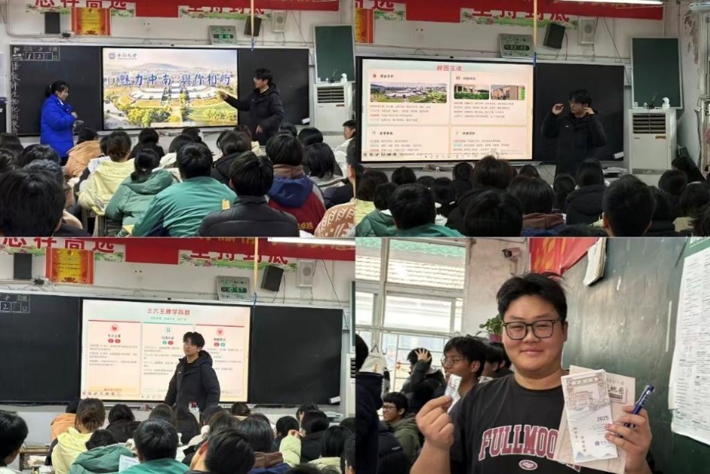 活动当天,团队负责人张鑫与成员黄子阳、段雨佳深入高三年级,围绕“硬核中南”“魅力中南”“相约中南”三个方面,系统讲解了中南大学的历史底蕴、学科优势、师资力量及科研实力,展现了校园学习生活环境。同时,团队成员结合安徽省近年招生政策与录取数据,为在场学生提供了针对性的备考指导和报考建议。