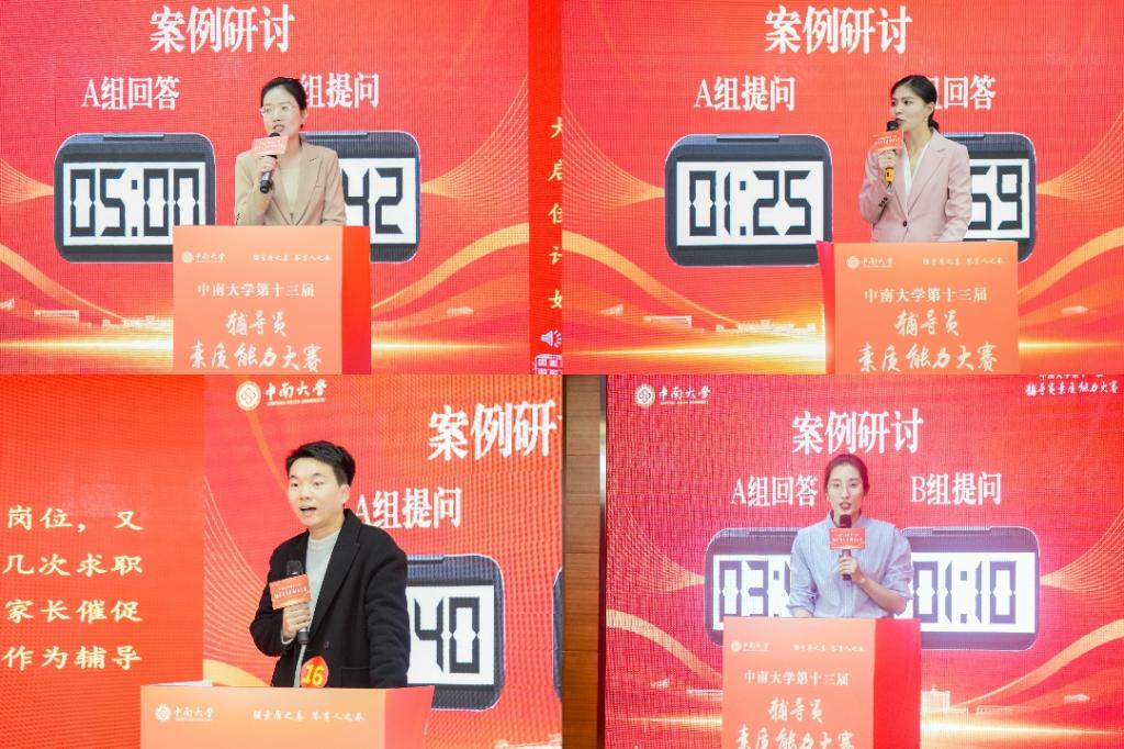 案例研讨环节采用两两组队、“我问你答”的方式,两位选手围绕同一个案例共析原因、共研对策、共结规律。材料科学与工程学院罗吴赞老师以“围绕学生、关照学生、服务学生”为遵循,构建了“扶志、扶智、扶业、扶贫”的学生支持体系;粉末冶金研究院李卉淼老师则以习近平总书记所提出的“健康是1,其他是后面的0”重要论述为指引,始终紧扣学生“生命至上、安全第一”理念,解决思想问题与解决实际问题相结合,阐述落地工作举措。