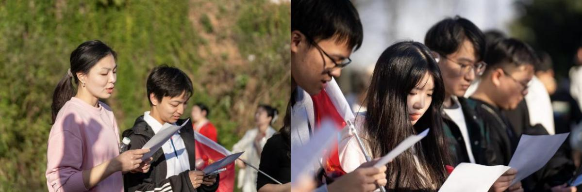 随后,我院队伍在登山途中精彩开展了三项特色环节。“党史问答”环节,党员们踊跃答题,在青山绿水间巩固了理论知识;“创意合影”环节,各小组摆出创意造型,展现了队伍的蓬勃朝气;“经典诵读环节”,队员们在山顶齐声诵读红色经典,铿锵之声回荡山林,接受了深刻的思想洗礼。