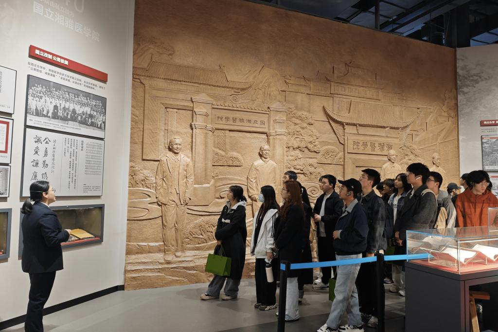 理论学习结束后,支部成员前往中南大学校史馆。在讲解员的引导下,大家详细了解到学校从抗战时期创办到新中国成立后逐步发展的历程。馆内陈列的建校初期教学手稿、老一辈科学家使用过的实验仪器、以及不同时期师生参与国家重点项目的影像资料,让同学们直观感受到学校“知行合一、经世致用”的办学理念与“务实报国”的精神内核。